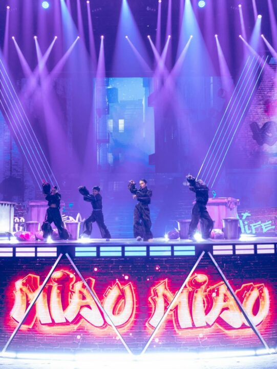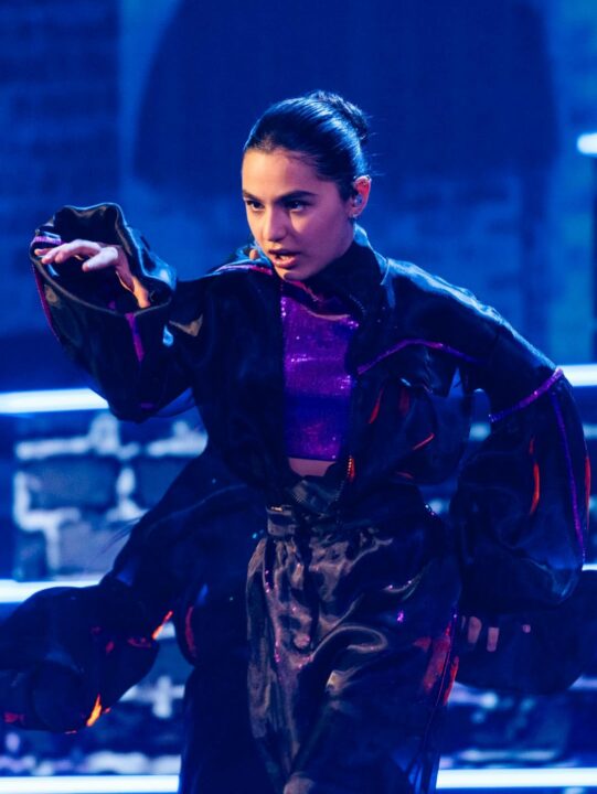 Yağmur began wrapped in a black coat covered in glitter, then dazzled with a surprising costume change revealing a purple sequin top. Around her, five dancers brought to life a vibrant staging marked by graffiti, intense colors, and almost feline movements — perfect for what is already shaping up to be the most “animal” song of this edition.