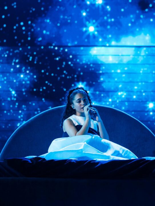 The proposal from San Marino came from Martina CRV, who with her song “Beyond the Stars” delivered a performance full of country charm and modern western aesthetics. With a silver glittery guitar and a stool as the main prop, Martina began the performance sitting on a silver moon, creating a simple but very striking opening.