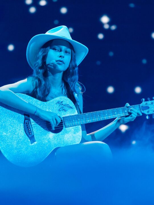 On the screens, neon letters shone while landscapes of mountains, deserts, and endless horizons passed by, reinforcing that cinematic atmosphere reminiscent of the great stages of the Wild West. The combination of warm tones, rustic textures, and sparkling lights made the performance feel intimate and visually appealing.