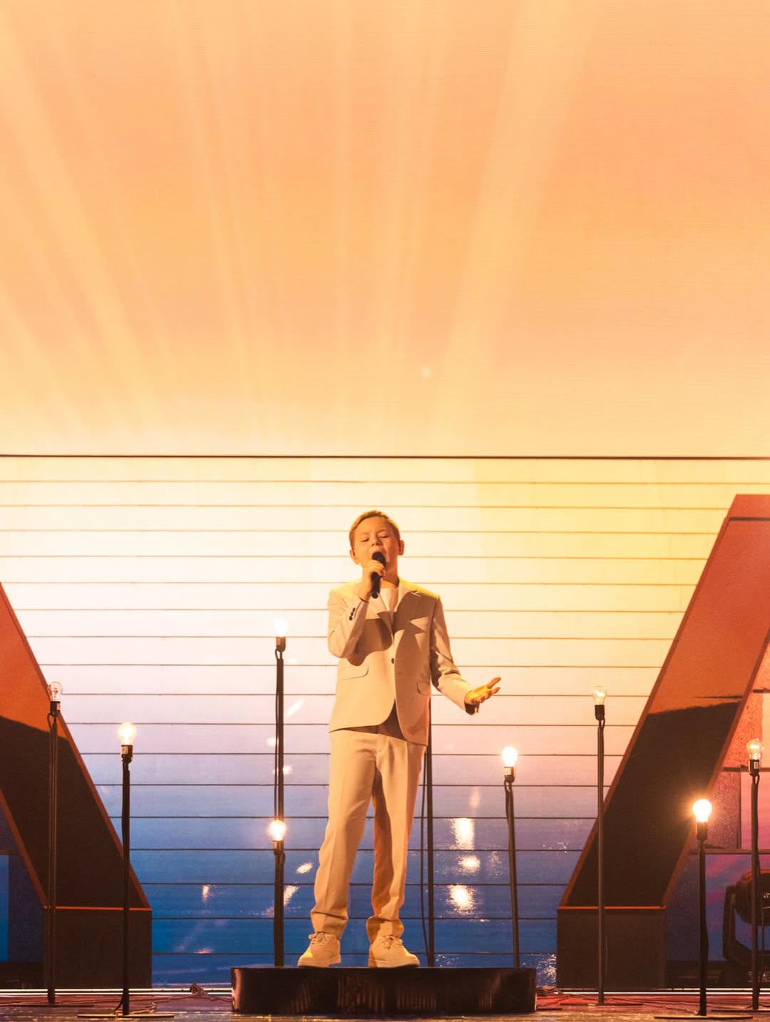It was Croatia’s turn with Marino Vrgoč, who, with his song “Snovi,” transformed the stage into a visual journey full of sensitivity. Dressed in an impeccable white suit, Marino appeared alone on stage, elevated on a circular platform that became the center of all attention.
