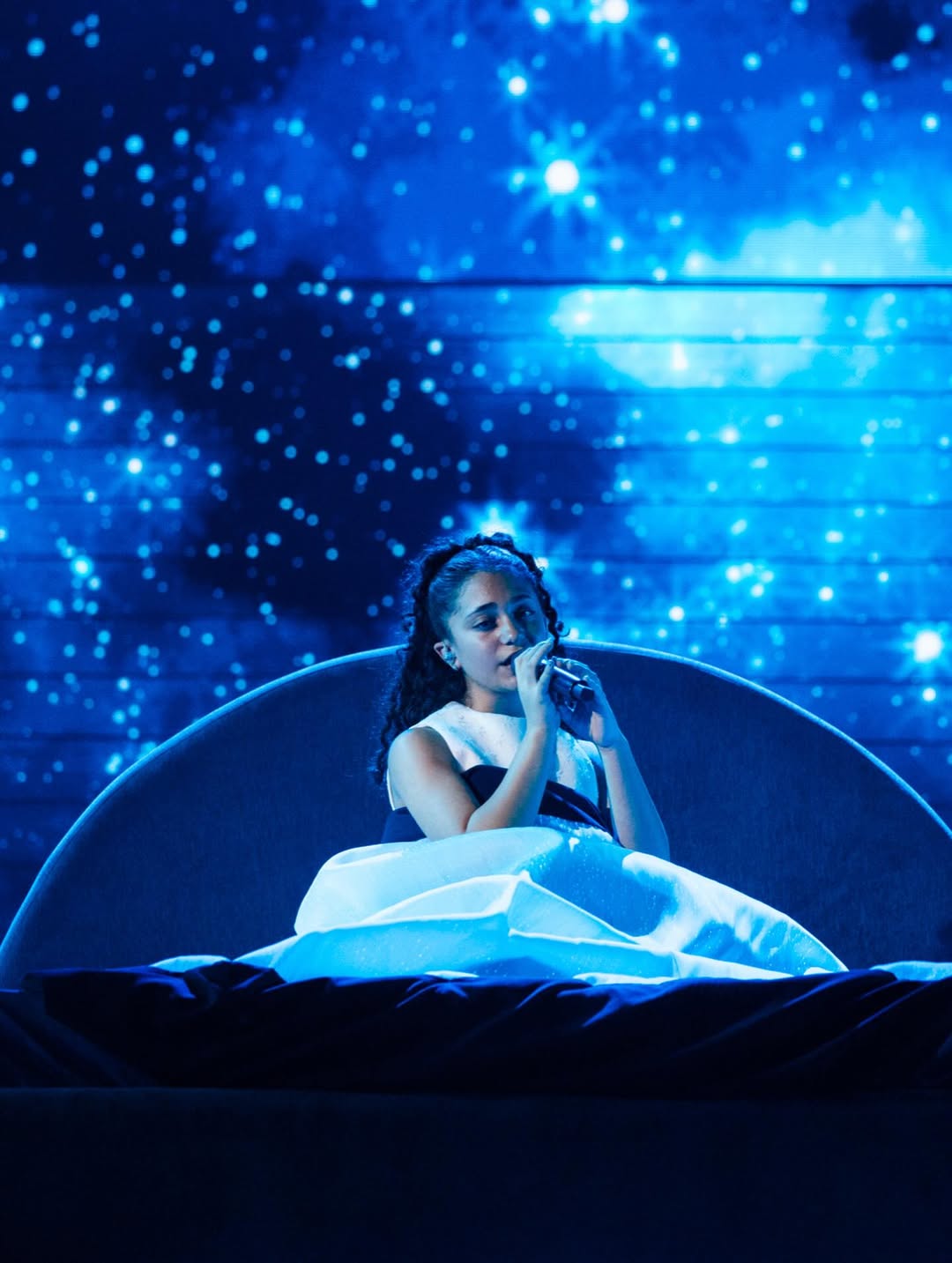 Dressed in an elegant white gown and accompanied by five classical dancers wearing the same color, the performance opened with an almost cinematic image: Eliza gently waking up on a rounded-edge bed.