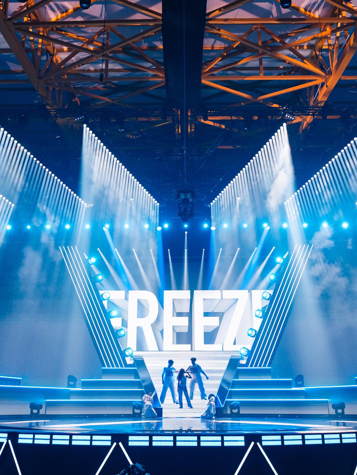 The abstract visuals, neon colors in various shades of blue, along with the word ‘Freeze’ have a prominent role on the screens.