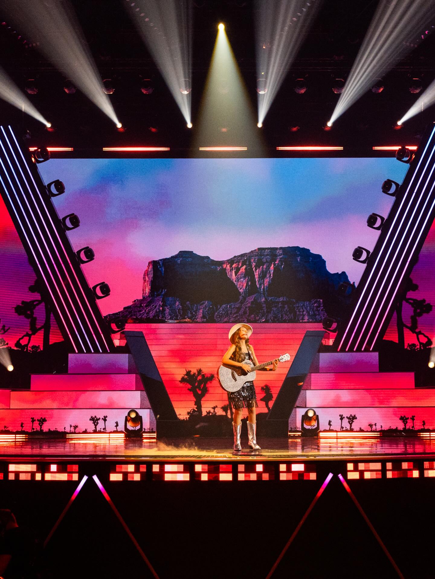 The proposal from San Marino came from Martina CRV, who with her song “Beyond the Stars” delivered a performance full of country charm and modern western aesthetics. With a silver glittery guitar and a stool as the main prop, Martina began the performance sitting on a silver moon, creating a simple but very striking opening.