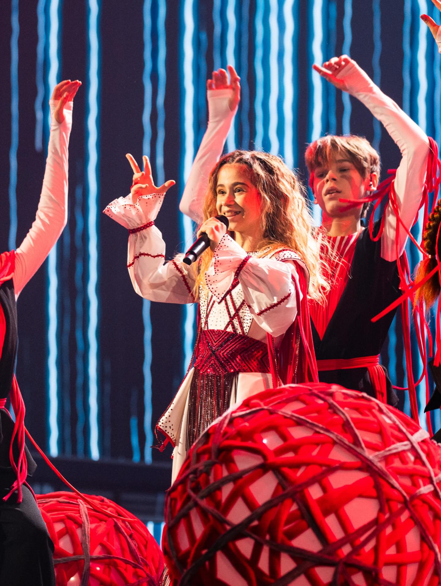 The proposal from Ukraine comes from Sofia Nersesian, who with her song “Motanka” opts for a traditional white and red costume, adorned with red ribbons and traditional dolls that reinforce the cultural identity of the performance.