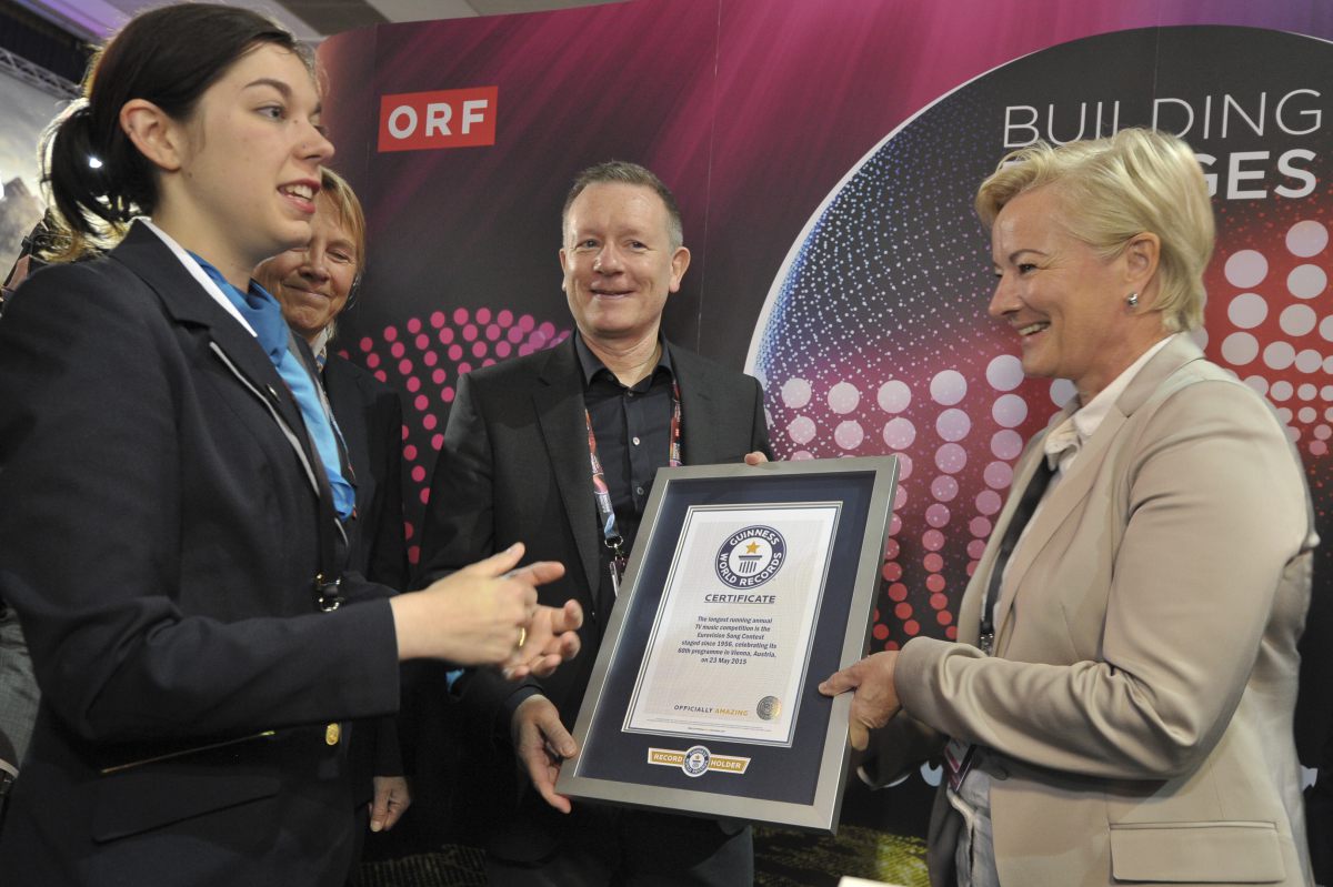 Eurovision.tv reports that an adjudicator from the global authority in record-breaking achievement was in Vienna, Austria to present EBU Director General Ingrid Deltenre and Executive Supervisor Jon Ola Sand with the award on the day of the 2015 Grand Final which will be seen by nearly 200 million people in 45 countries tonight, 23rd of May.