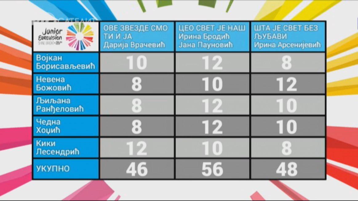 After all the artists performed, the jury panel gave 8-10-12 points to the songs taking part, giving the third place with 46 points to Darija Vračević, the second place with 48 points to Irina Arsenijević and the first place to Irina Brodić and Jana Paunović with 56 points.